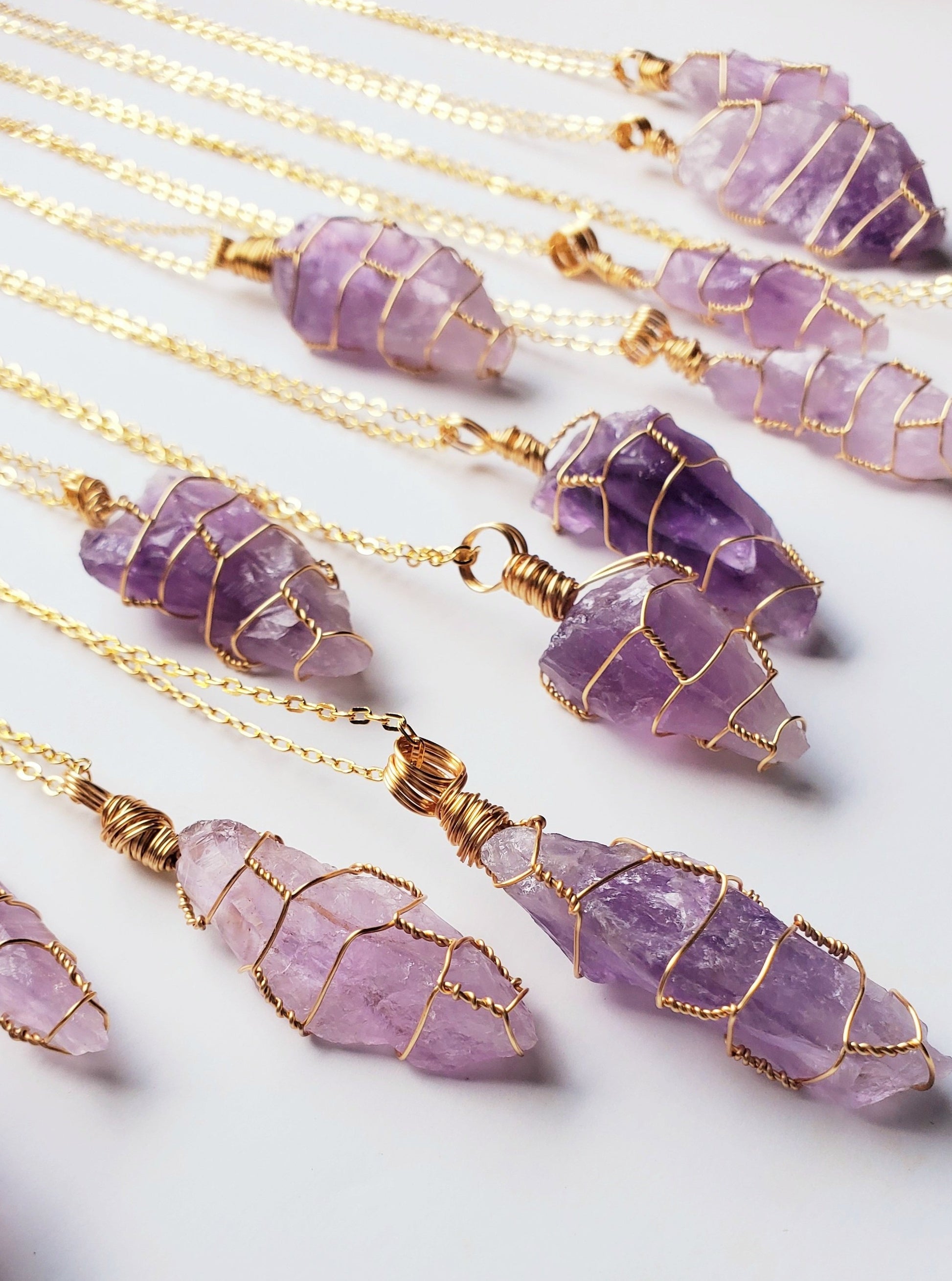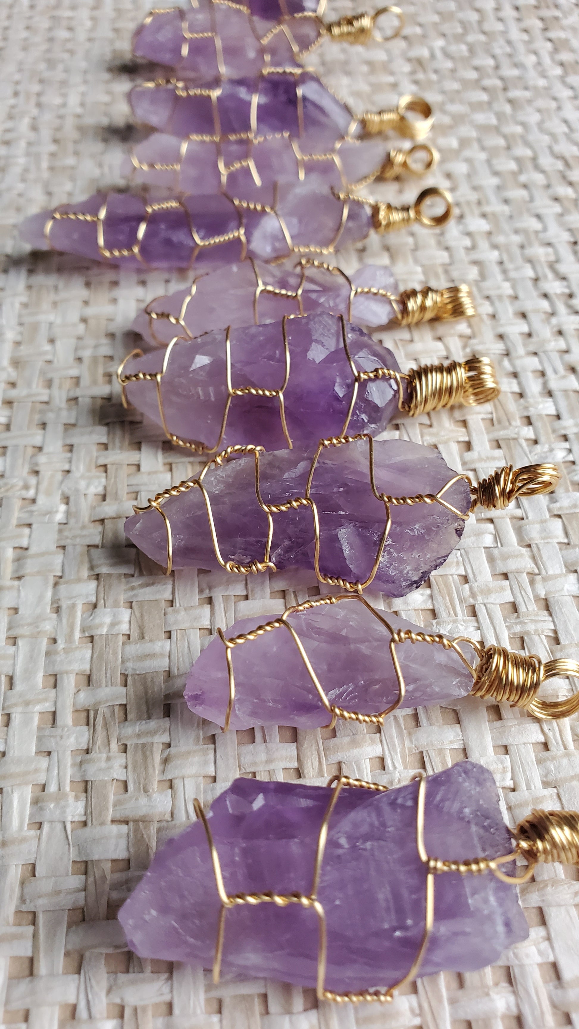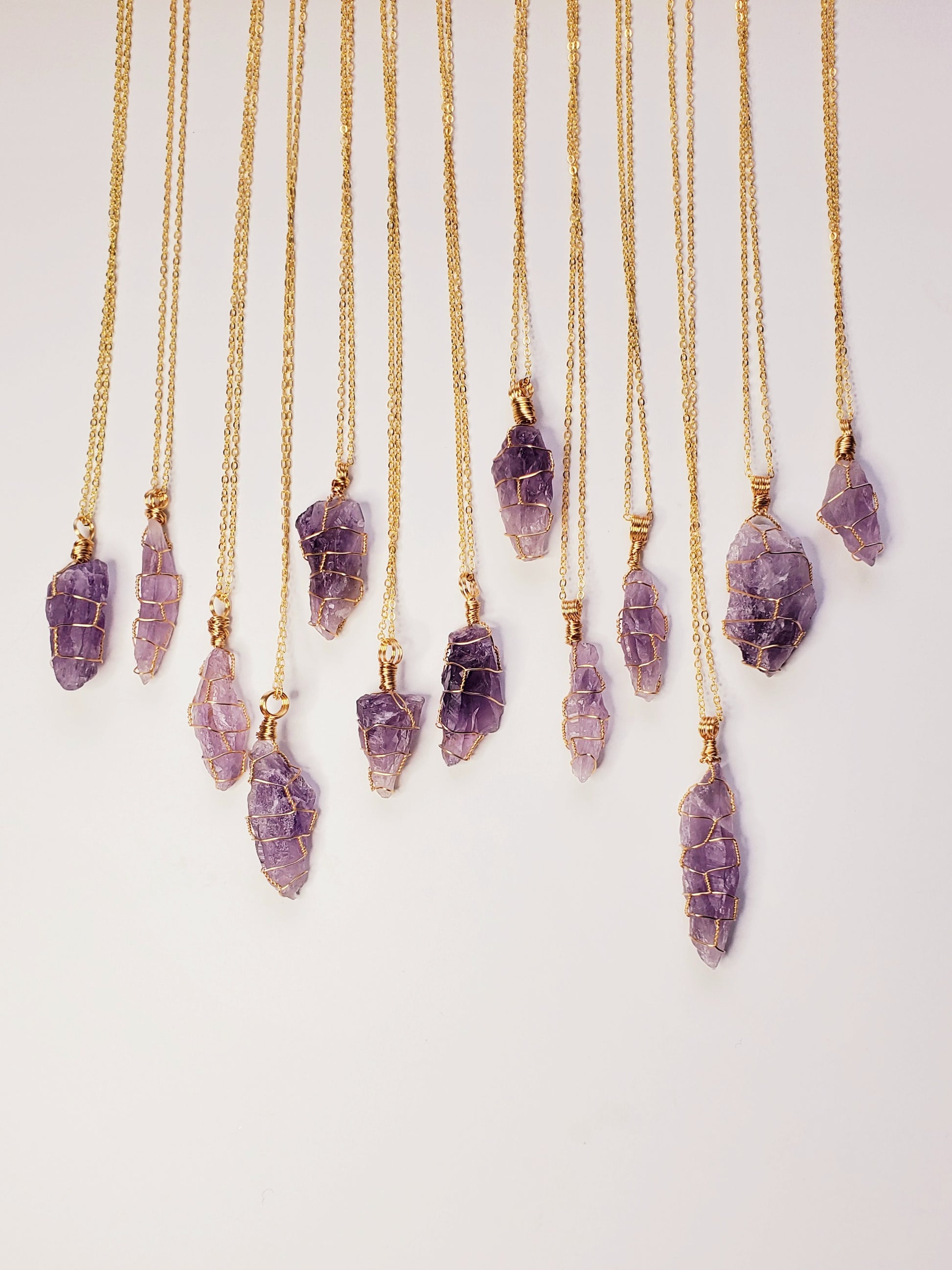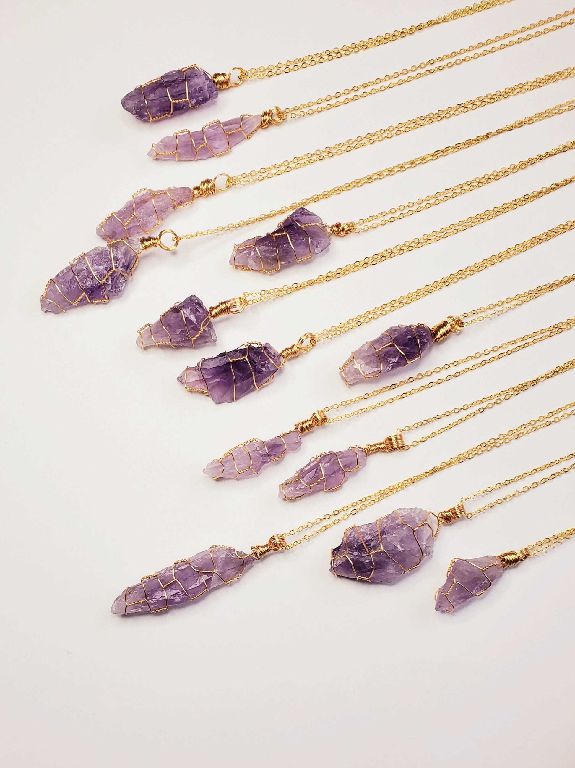 Raw amethyst stone wire wrapped necklace. 18K gold plated chain.