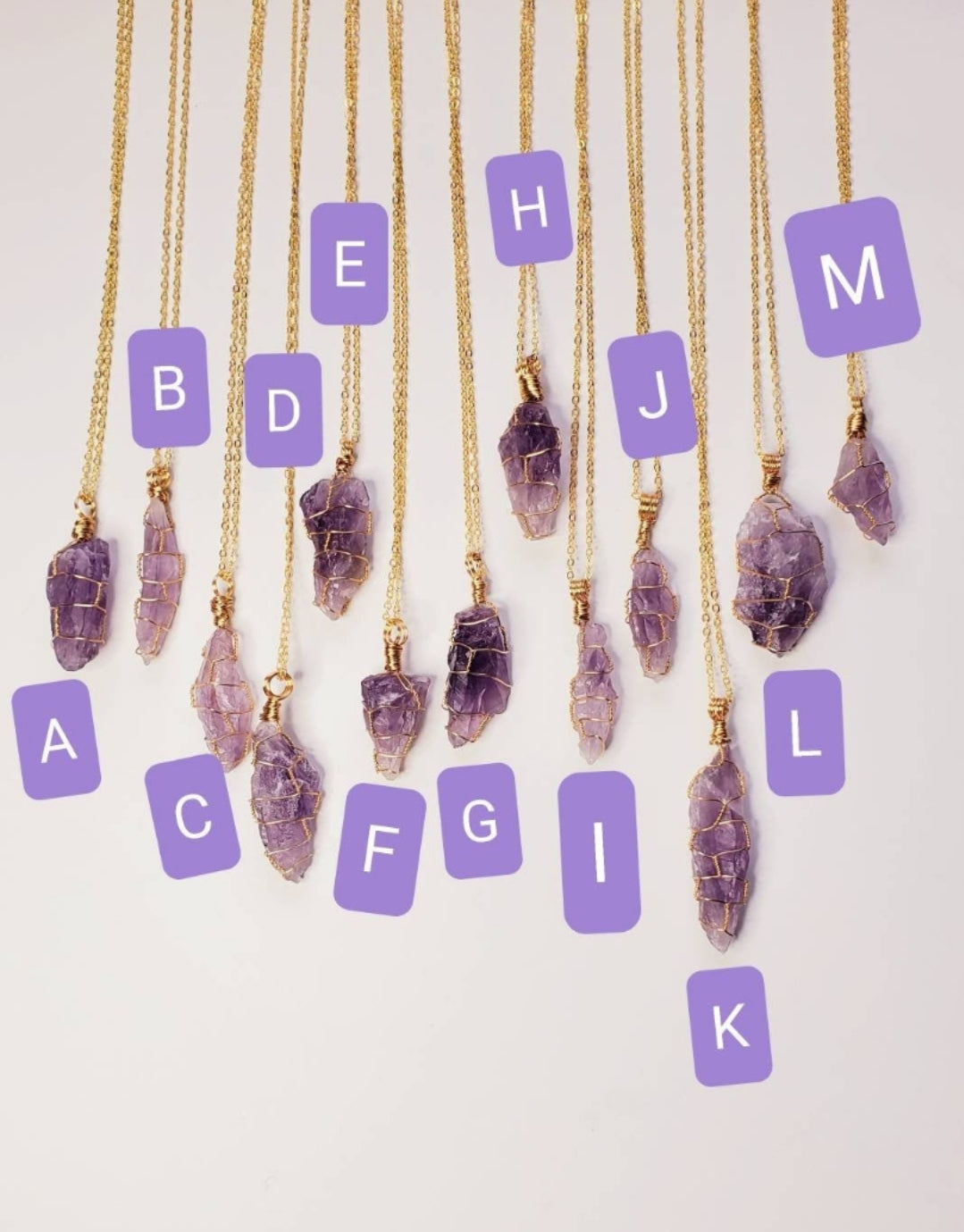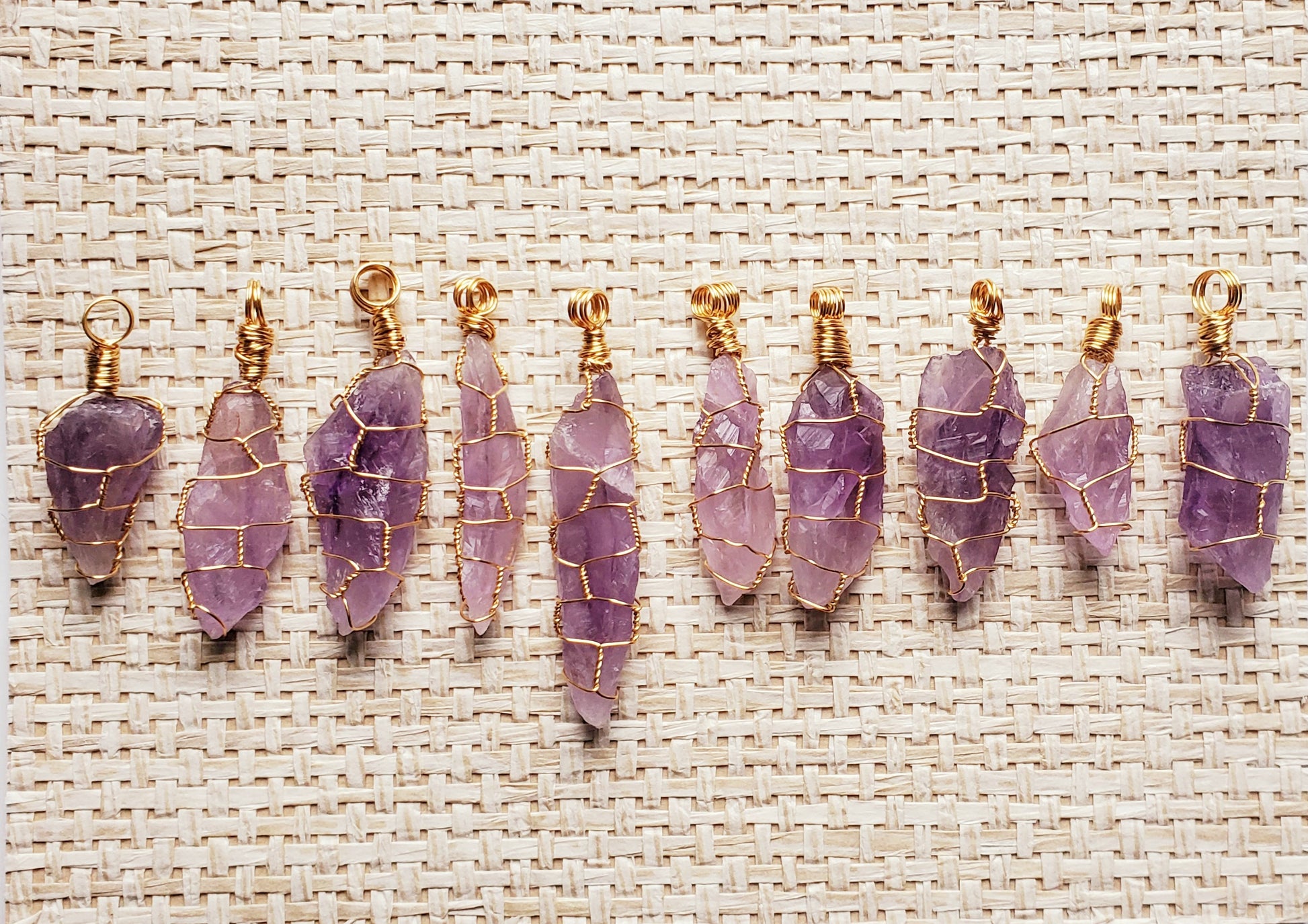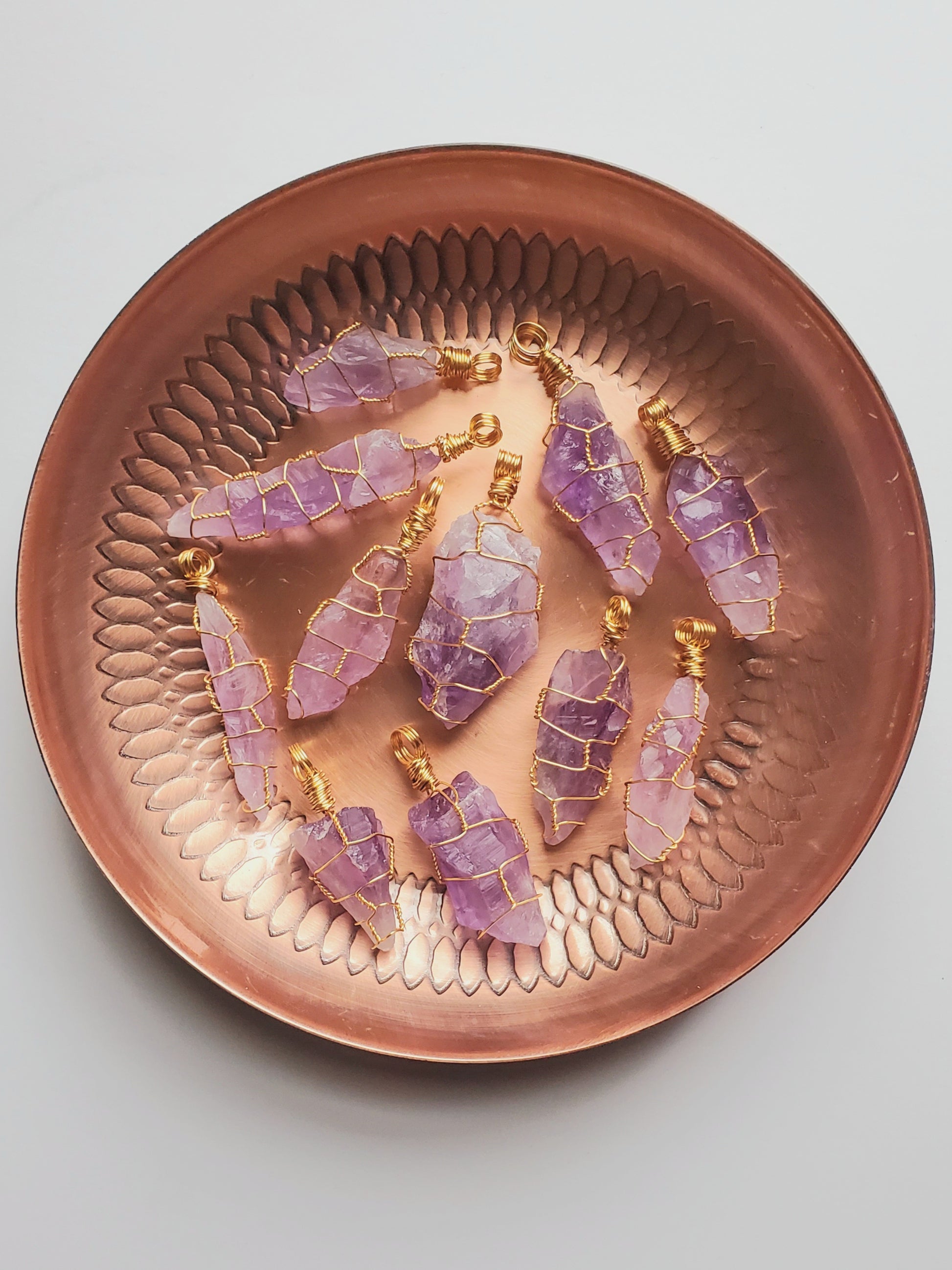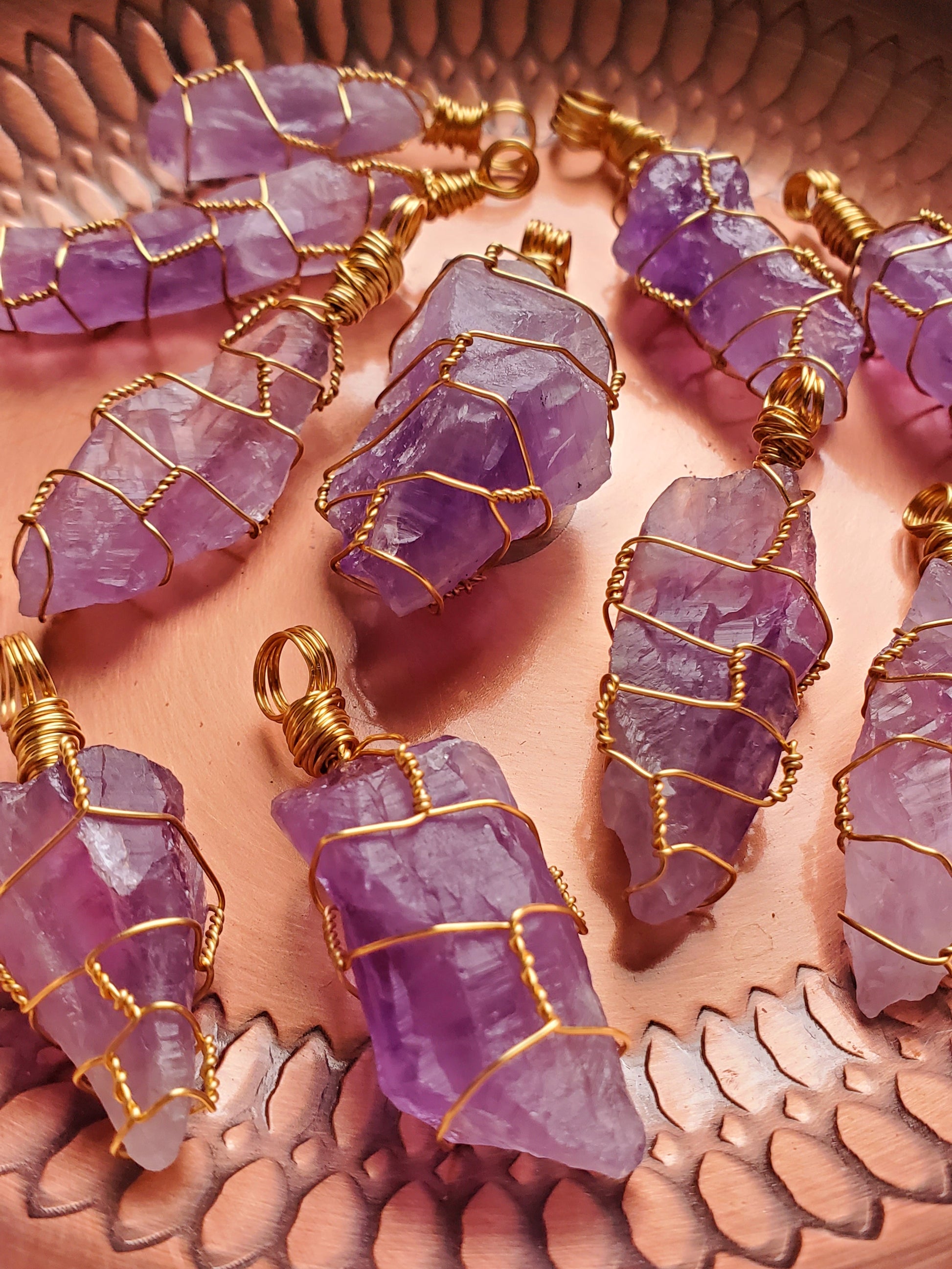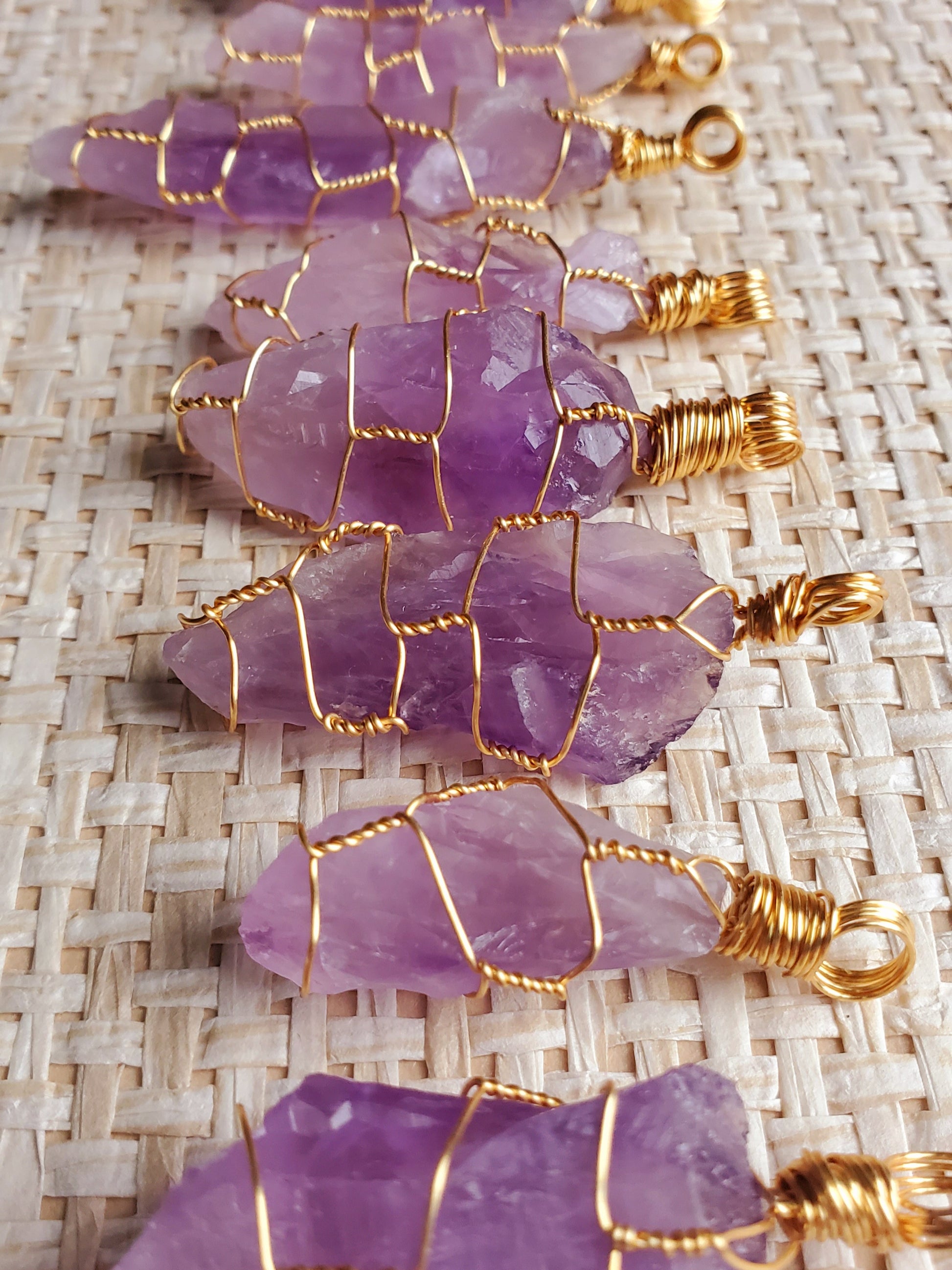Raw amethyst stone wire wrapped necklace. 18K gold plated chain.